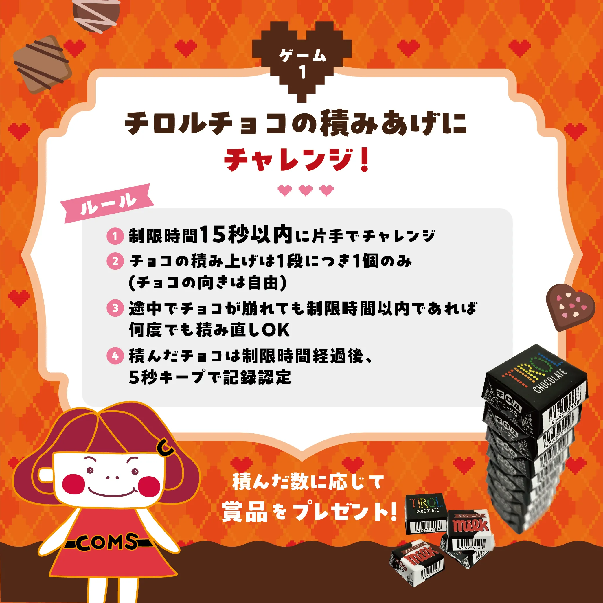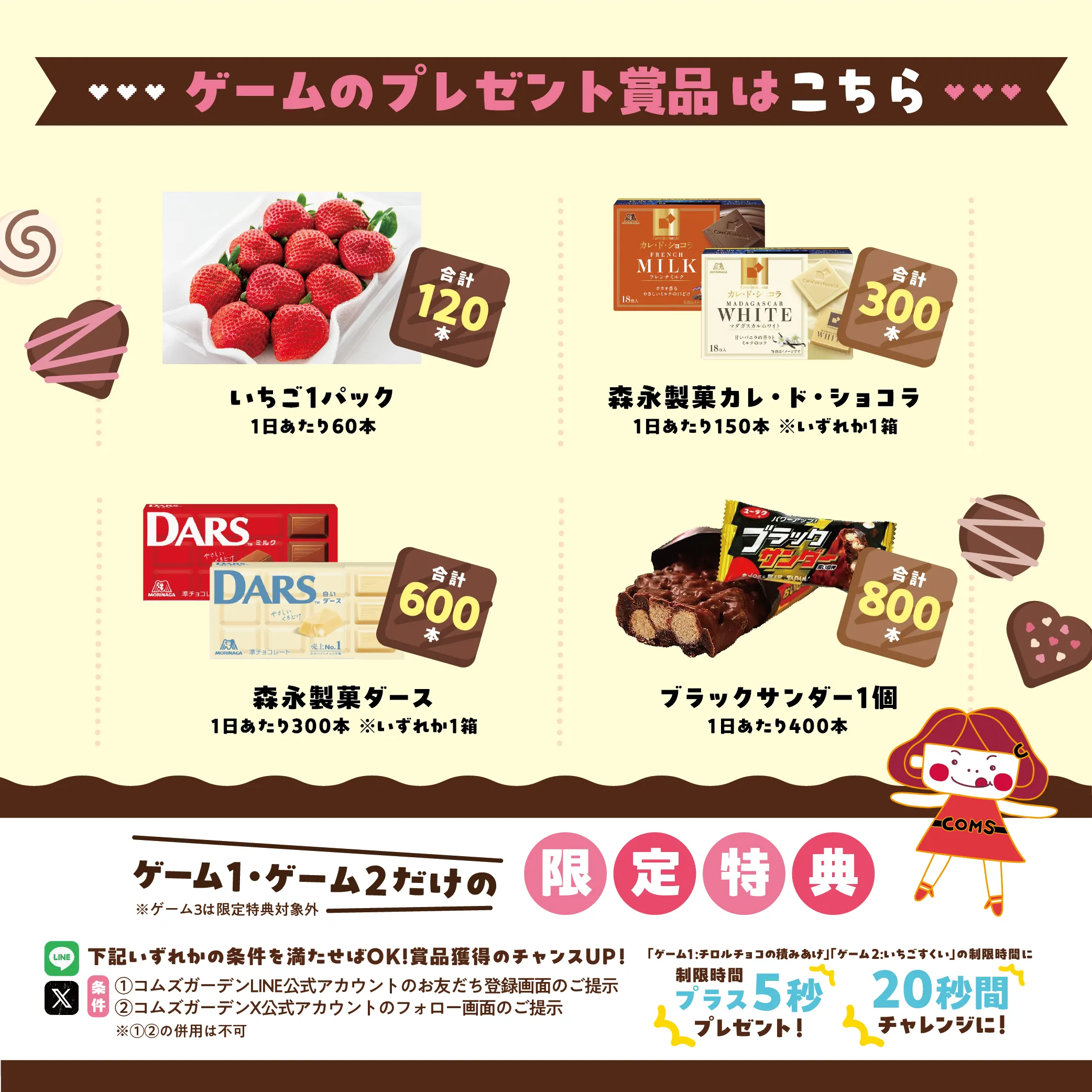 【チロルチョコの積みあげ】、【いちごすくい】【じゃんぼサイコロ】のいずれか一つのゲームにご参加!